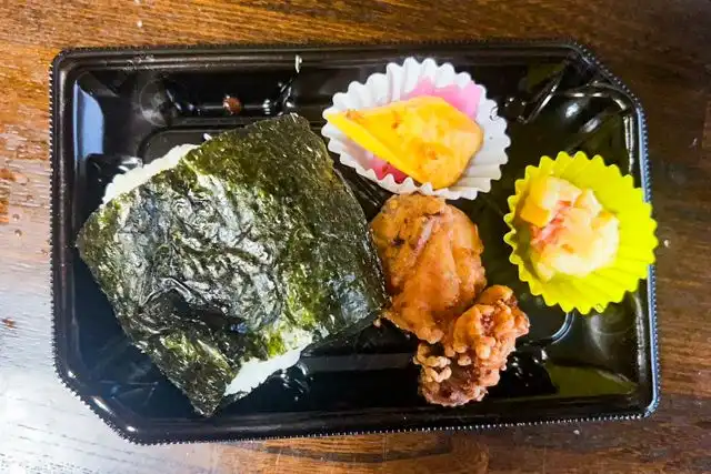 おかかおにぎり(ご飯120g)、唐揚げ1個、お漬物、卵焼き、季節の副菜1種類