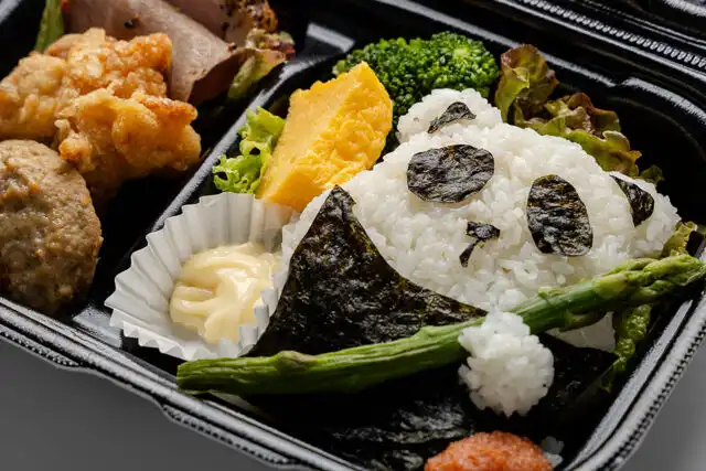 パンダの顔をかたどったご飯を中心に、唐揚げや玉子焼き、ミニハンバーグなど、人気のおかずをぎゅっと詰め込みました。
