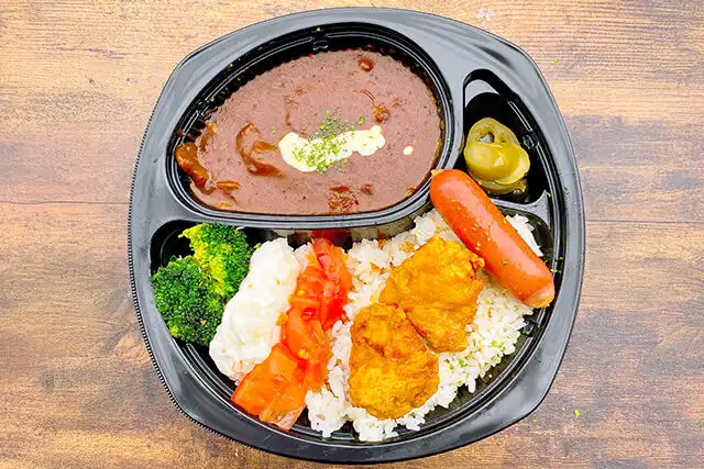 ごはん200g/ハヤシルー/トマト/ポテトサラダ/ブロッコリー/ウインナー/唐揚げ/ピクルス