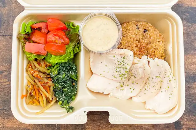 酵素玄米/低温調理チキン/ほうれん草の胡麻和え/きんぴら/ミニサラダ