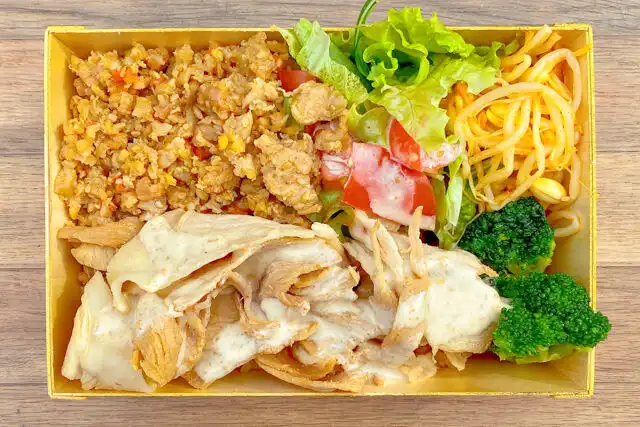 豚しゃぶの旨味を引き立てる多彩なサラダが絶妙に組み合わさったお弁当です。新鮮なブロッコリーやトマトのサラダが楽しめます。