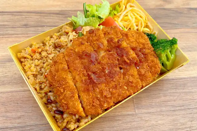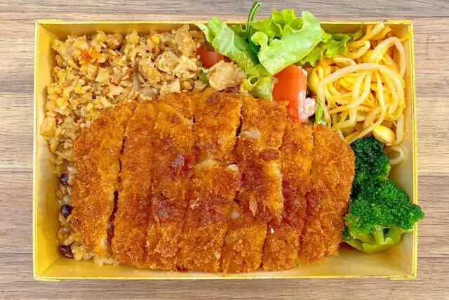 ジューシーでおおぶりなロースかつと一緒に、新鮮なグリーンサラダやポテトサラダ、ブロッコリー、トマトサラダが彩り豊かに盛り付けられ、バランスの良い食事を楽しめます。酵素玄米はそぼろがのっていてヘルシーと同時にお肉もしっかり楽しめるお弁当です。