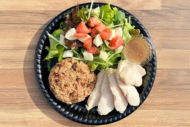 柔らかい低温調理チキンとクリーミーなガーデンモッツァレラが織りなす贅沢なハーモニー。代謝を促すといわれている酵素玄米が絶妙にマッチ。見た目以上のボリューム感と満足感をお届けします。