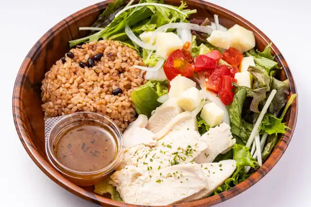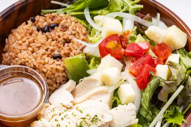 柔らかい低温調理チキンとクリーミーなガーデンモッツァレラが織りなす贅沢なハーモニー。代謝を促すといわれている酵素玄米が絶妙にマッチ。見た目以上のボリューム感と満足感をお届けします。