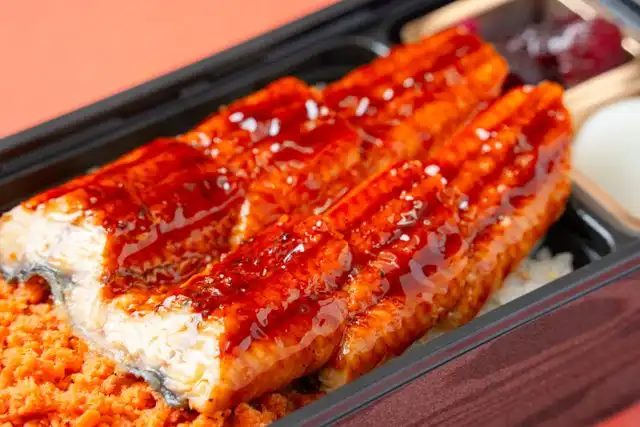 香ばしく焼き上げたうなぎと、旨み豊かな鮭のほぐしを贅沢に盛り付けたお重です。うなぎのコクと鮭のやさしい塩味が絶妙に調和し、彩りも美しく、最後まで飽きずに楽しめる満足感のある一品です。