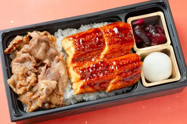 白米200g/うなぎの蒲焼/うなぎのタレ/山椒/豚すき/香の物/プチデザート