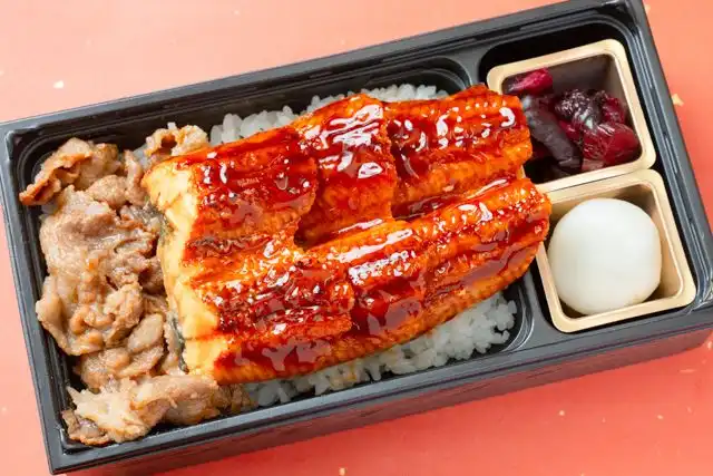 鰻と和牛すきやきを贅沢に盛り込んだお重のお弁当です。鰻の濃厚な旨みと和牛のコク深い味わいが重なり合い、ご飯との相性も良く、上品で奥行きのある味わいを引き立てます。