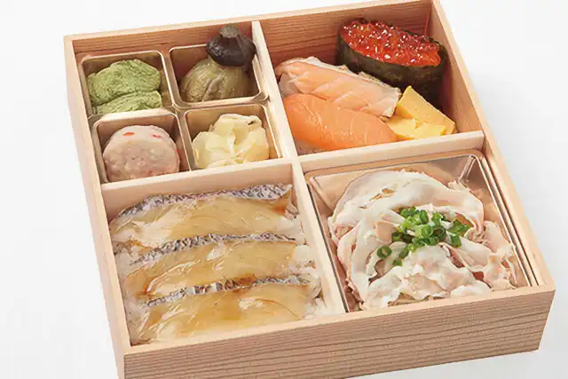 活〆鯛の漬け丼(ご飯120g)、握り(イクラ、炙りトロサーモン、サーモン)、豚しゃぶ、茄子の煮びたし、飛龍頭、甘酢生姜、抹茶わらび餅