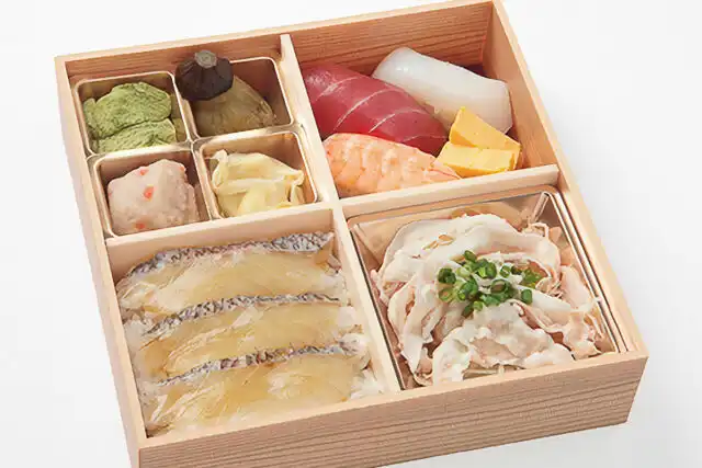 特製タレをつけた活〆の鯛を丼風に仕立て、握り寿司を添えた海鮮を楽しめるお弁当です。