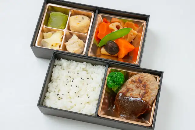 彩菜弁当 虎龍のデミハンバーグ2段弁当は、厳選した和牛ハンバーグと赤ワインを加えたソースの組み合わせが絶妙。彩り鮮やかな野菜やおかずもたっぷりと添え、高級感のあるお弁当に仕上げました。自慢のご飯が、食材の旨味を引き立てます。季節に関係なくお召し上がりいただける、幅広い種類の弁当をご用意しています。ぜひ、ご注文ください。