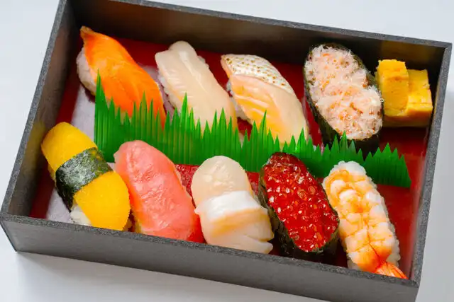 炙りトロサーモン、サーモン、帆立、つぶ貝、数の子、イクラ、カニ、まぐろ、エビ、玉子焼き、ガリ
