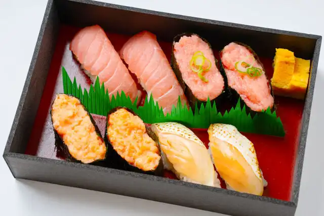 バチトロ2貫、ネギトロ2貫、炙りトロサーモン2貫、サケトロ2貫、玉子焼き、ガリ