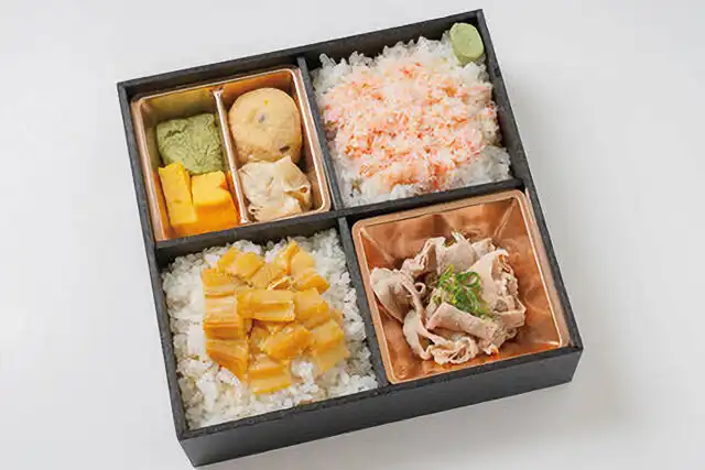 穴子重(白米120g)、蟹ごはん(白米120g)、豚しゃぶ、飛竜頭、玉子焼き、焼売、抹茶わらび餅
