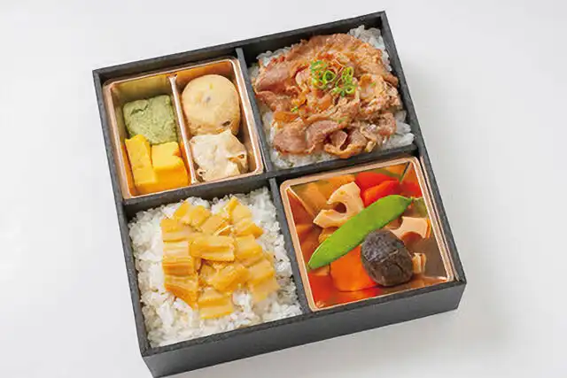 穴子重(白米120g)、牛ご飯(白米120g)、飛竜頭、玉子焼き、焼売、抹茶わらび餅