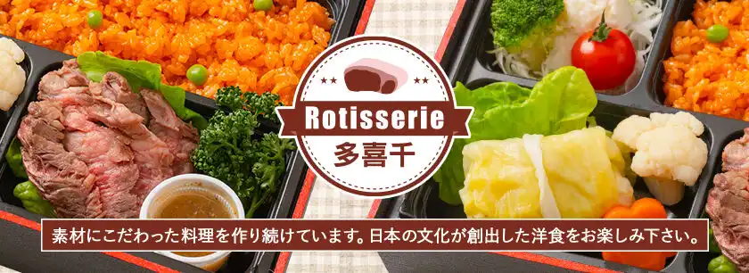 Rotisserie 多喜千がご提供する仕出し弁当。おすすめの特選ビフテキとハンバーグ with 特製ケチャップライスをオフィスやご自宅でお楽しみください。洋食屋のハンバーグは自家製デミグラスソースでお楽しみ下さい。当店のステーキは、成長ホルモン無投与の安心安全な「グラスフェッドビーフ」を使用しております。グラスフェッドビーフは、高たんぱく・低脂質な肉質で、たくさん食べても胃もたれしづらく、良質なタンパク質を豊富に摂取できる特徴があります。ランチミーティングやご家族でのお集まりなど、ご利用シーンに合わせて配達いたします。