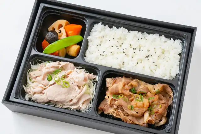 「肉嶺」の和牛すき焼きと豚しゃぶ弁当【上】は、宅配弁当としてお届けする高級弁当です。見た目にも魅力的な彩り豊かなお弁当には、濃厚な和牛すき焼きとサッパリとした豚しゃぶがセットになっています。ご飯との相性も抜群で、種類も豊富。季節を問わず、ご注文いただけます。
