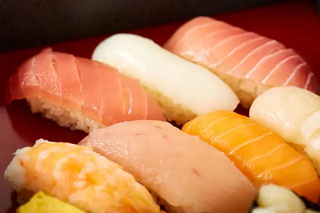 まぐろ、いか、中トロ、えび、びんちょう、サーモン、帆立、玉子、イクラ、小柱、ガリ【時化や仕入により予告なしに内容が変わる場合がございます】