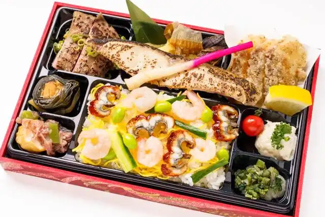 ちらし寿司(白米160g)、真鯛の⼭椒⻯⽥揚げ、レモン、鮭の⻄京焼、鶏の柚子胡椒焼き、季節の和惣菜、ポテトサラダ