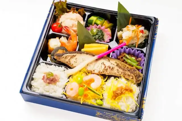 特選ちらし寿司(白米60g)、彩りご飯2種(120g)、鮭の⻄京焼、⽜しぐれ煮、ポテトサラダ、海老塩茹で、玉子焼き、季節の和惣菜