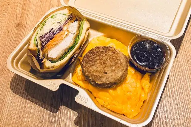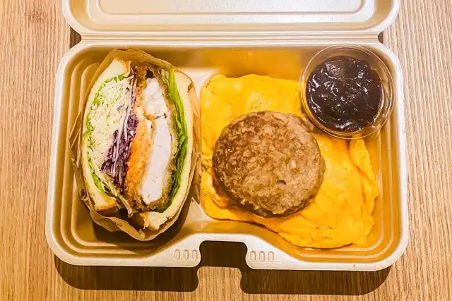 オムライスとボリューミーな野菜たっぷりカツサンドのセットです。まんぷくHappyな欲張り弁当を楽しくお召し上がり下さい。