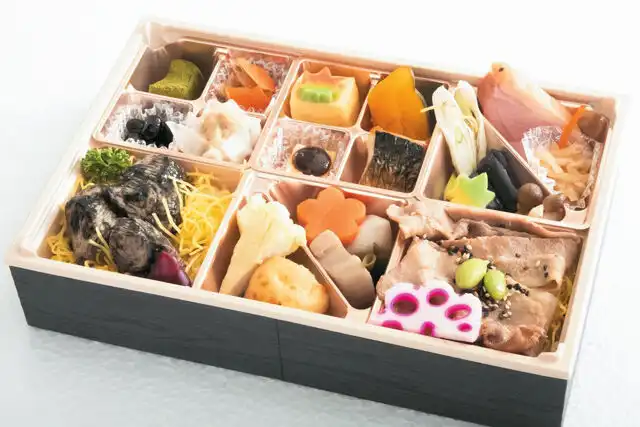 鶏の炭火焼(ご飯90g)、豚の生姜焼き(ご飯90g)、錦糸玉子、鴨ロース、切り干し大根、季節の魚の塩焼き、かぼちゃの煮物、厚揚げ、生麩田楽、きんぴら、焼売、黒豆甘露煮、わらびもち、炊き合わせ、がんもどき、練り物
