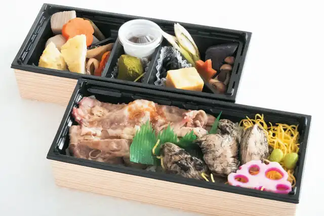 ご飯180g、牛焼きしゃぶ、鶏の炭火焼き、錦糸玉子、出汁巻き、煮物、黒豆、きんぴら、わらびもち