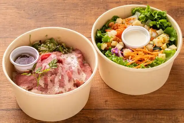 ローストビーフ丼(ご飯180g、オニオンソース)、シーザーサラダ(シーザードレッシング)