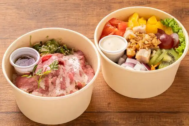 ローストビーフ丼(ご飯180g、オニオンソース)、フルーツサラダ
