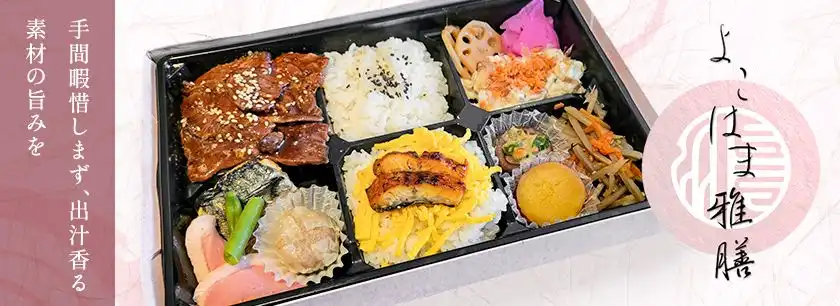 手間暇を惜しまず、厳選した素材の持ち味を引き出す出汁にこだわって丁寧に仕立てました。派手さより「本当に美味しい」を大切に、ひと口ごとにやさしい旨みが広がる、よこはま雅膳の自慢のお弁当です。