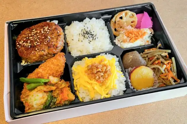 ご飯80g/錦糸卵・そぼろご飯80g/和風おろしハンバーグ/蓮根梅肉和え/鮭の和風ポテトサラダ/ホキの白身フライ/かき揚げ/玉こんにゃく/さつまいもの甘露煮/きんぷらごぼう/香の物