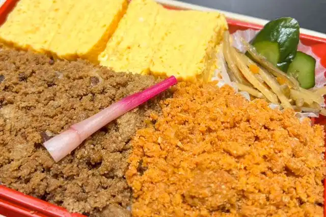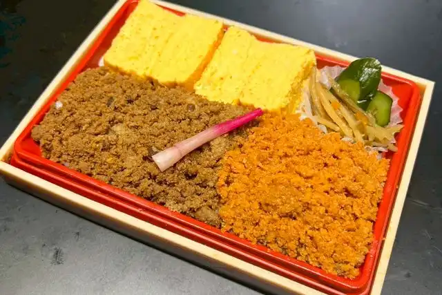 自社ブランドの「幸せたまご」を使用した極上の玉子焼きをお楽しみ頂ける逸品弁当。自社で養鶏場を経営している当店だからこその、コク深い味わいの鶏そぼろはまさに絶品。ご飯の進む濃厚な味わいの鮭明太子も一緒にお召し上がりいただけます。