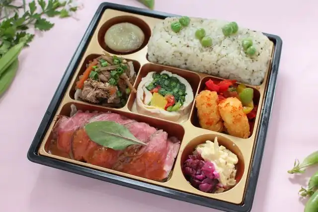 赤身ステーキ / 季節野菜のポピーエット / 牛肉のラグー / 3種のパプリカサラダ / スパイスハッシュドポテト / 大根マヨネーズ / しば漬けアッシェ / 青りんごの生チョコ / グリンピースご飯170g※仕入れ状況により、副菜の内容が変わる場合がございます