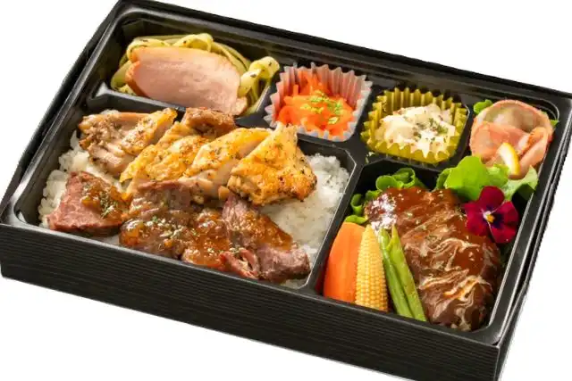 希少部位(サガリ)の牛ステーキ&グリルチキンと牛タンハンバーグのシャンピニオンソースかけ弁当