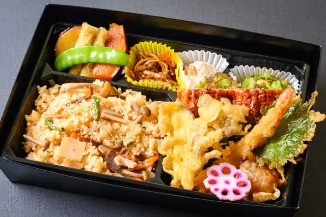 和風混ぜご飯250g、天婦羅、うなぎ、季節の副菜3種、煮物