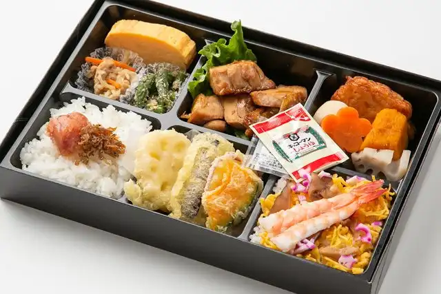 白米100g、海老チラシ100g、鶏照り焼き、季節の野菜天ぷら、玉子焼き、季節の総菜2種、煮物、明太子、ちりめん山椒