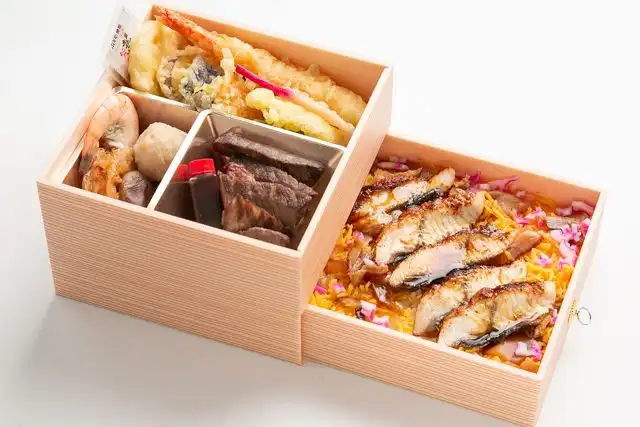 鰻チラシ200g、黒毛和牛ステーキ、季節の野菜天ぷら、レンコンはさみ揚げ、煮物(海老しんじょう、海老、しいたけ)