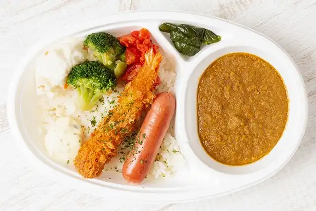 キーマカレー、ご飯(220g)、エビフライ、ウィンナー、ポテトサラダ、トマト、ブロッコリー、福神漬