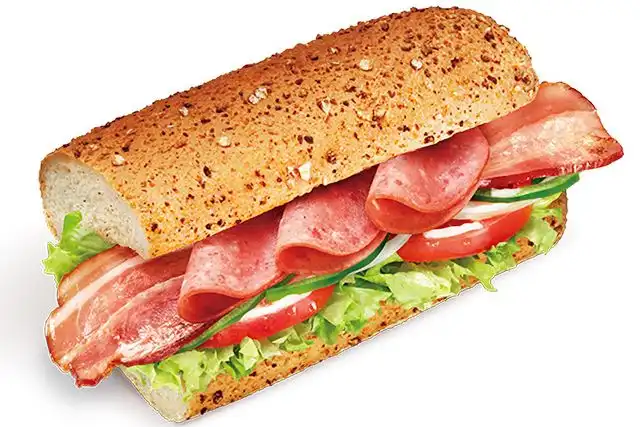 【サンドイッチ】パン、豚バラベーコン、セミドライソーセージ、レタス、トマト、オニオン、ピーマン、ドレッシング(シーザー)