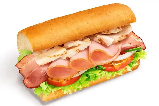 チキン、ハム、ベーコンのトリプルマッチ。たんぱく質を取りたい人におすすめです。お肉がたっぷりなのにヘルシーなサンドイッチです。