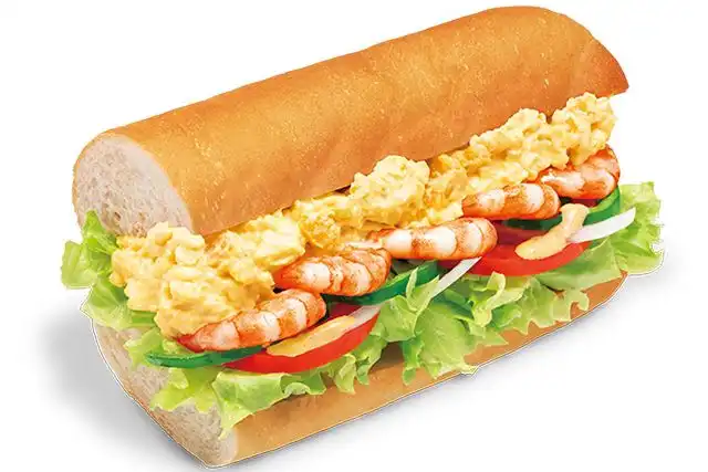 【サンドイッチ】パン、たまごサラダ、えび、レタス、トマト、オニオン、ピーマン、ドレッシング(チポトレソース)