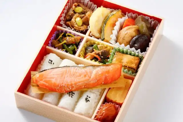 ご飯240g、銀鮭塩焼、玉子焼、がんもどき煮、牛肉煮、焼豆腐煮、蓮根天ぷら、調味梅干、蒟蒻煮、人参煮、きのこと小松菜の胡麻和え、茎わかめ醤油漬、椎茸煮、南瓜天ぷら、アサリ煮付、和風あん、蕗煮、青大豆煮、胡麻