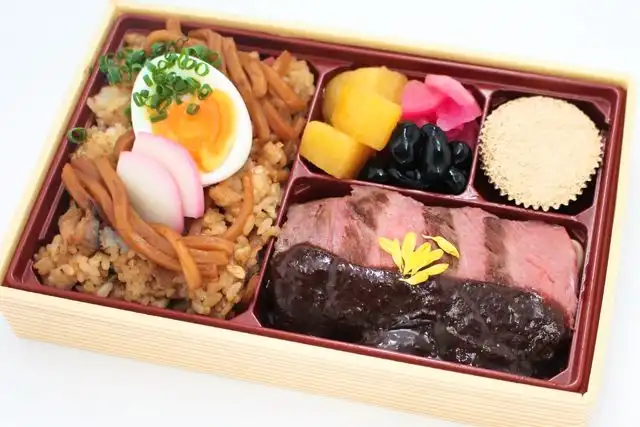 コシのある麺を味噌のコクとともに炊き上げた「味噌煮込みうどん飯」は、山本屋ならではの力強い味わいです。旨み豊かなビフテキを贅沢に増量。ほくほくと甘い大学芋、ふっくら炊き上げた黒豆、さっぱりとした漬物を添え、食後にはやさしい甘さの黒糖ケーキを。名古屋の伝統と職人の技を詰め込んだ、満足感あふれる特別なお弁当です。