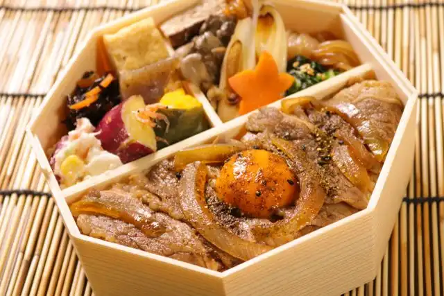 ご飯(200g)/黒毛和牛すき焼き/卵黄ソース/黒七味/きのこ/白滝/焼豆腐/焼葱/ほうれん草ナムル/かぼちゃ煮物/さつまいも甘露煮/卵焼き/ひじきの煮物/ポテトサラダ