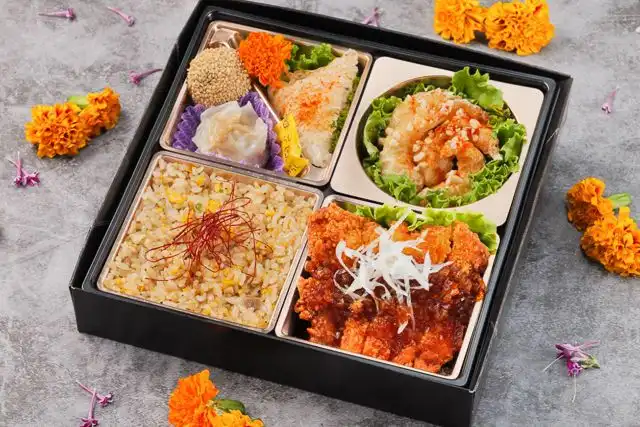 パラっと香ばしい「特製炒飯」に、香味ダレが決め手の「油淋鶏」、そしてコクのある特製ソースを絡めた「濃厚海老マヨネーズ」を組み合わせました。中華の人気メニューを一度に楽しめる、ボリューム満点の御膳です。箸休めの焼売や甘味の胡麻団子も入り、味のバランスも絶妙。お子様から大人まで大人気のメニューが揃った、満足度の高い一折です。