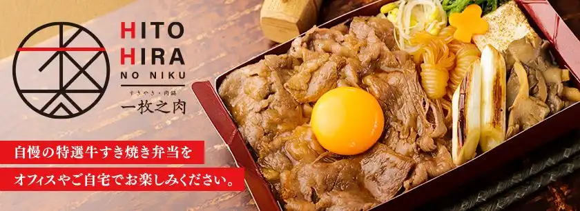 一枚之肉がご提供する仕出し弁当。 当店オリジナル割り下でさっと火を通した和牛すき焼きは口の中でとろけます。 自慢の特選牛すき焼き弁当をオフィスやご自宅でお楽しみください。