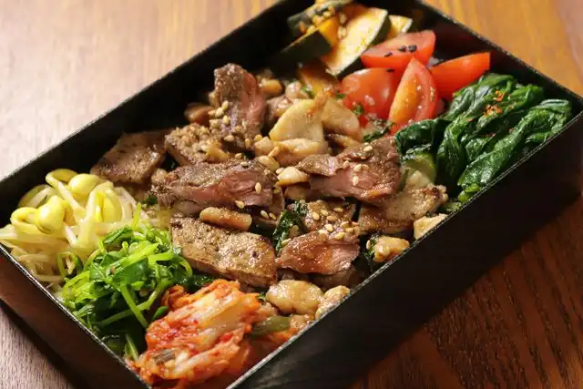 ご飯[200g]/豚バラ/牛ハラミ/鶏肉/ナムル(もやし、青菜、かぼちゃ、ほうれん草、トマト)/キムチ/焼肉のタレ