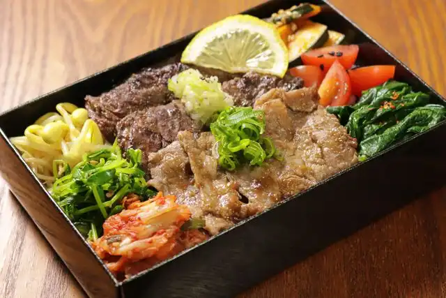 ご飯[200g]/牛カルビ/牛ハラミ/ナムル(もやし、青菜、かぼちゃ、ほうれん草、トマト)/キムチ/焼肉のタレ/塩ダレ
