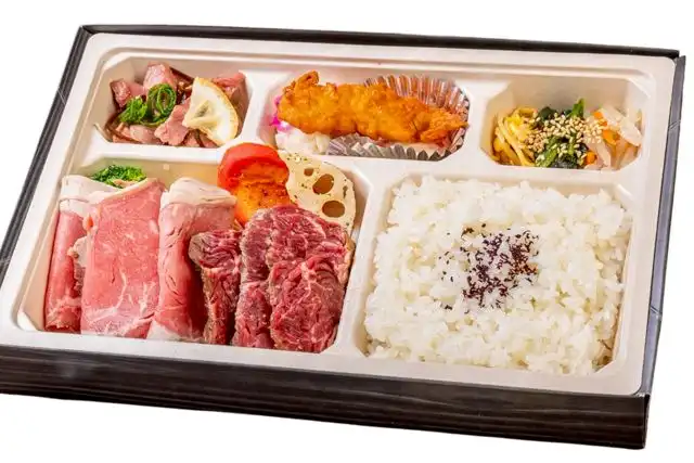 ご飯160g/ハラミステーキ(焼前50g)/自家製ローストビーフ40g/自家製ナムルの盛り合わせ/鶏天/ポテトサラダ/低温調理した牛タン塩昆布/グリル野菜