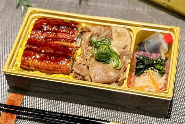 ご飯240g/鰻の蒲焼き/黒毛和牛切り落とし/大根のなます/漬物/蒲焼きのタレ/山椒小袋