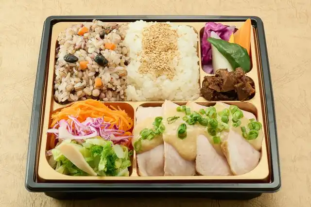 十六穀米170g / 豚ロースト / バーニャカウダー / 牛肉のラグー / キャロットラペ / 紫キャベツ / 白菜のソテー